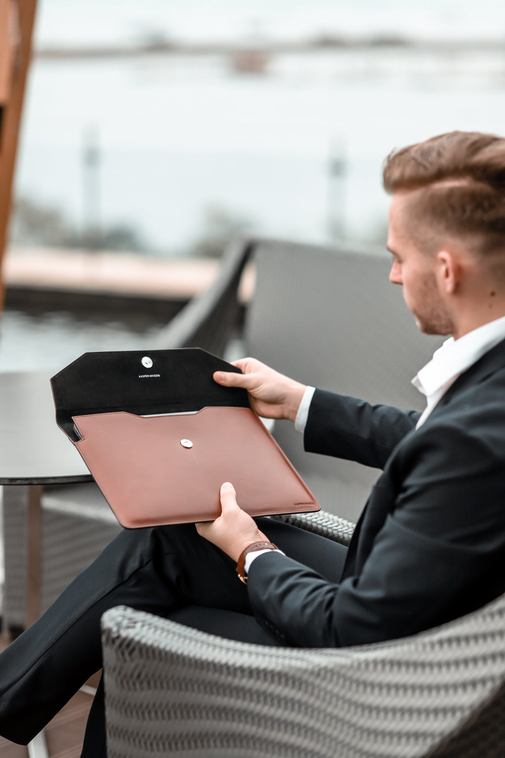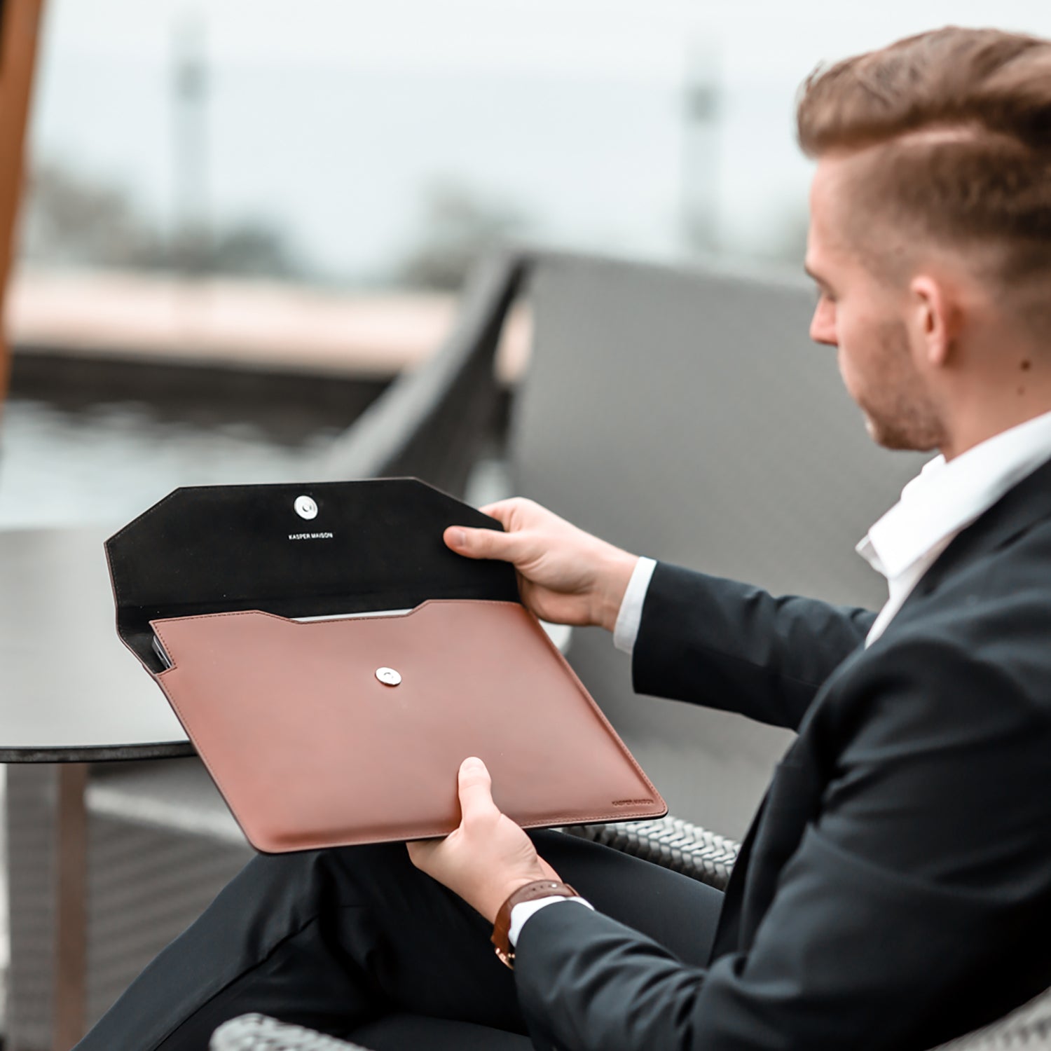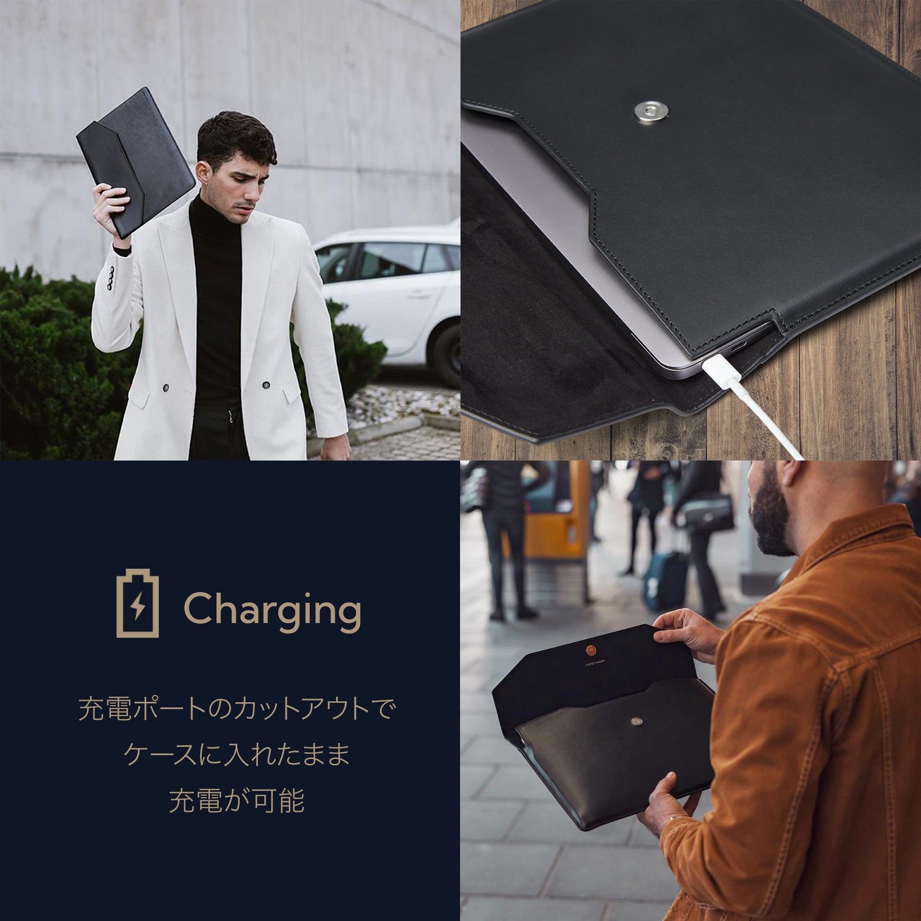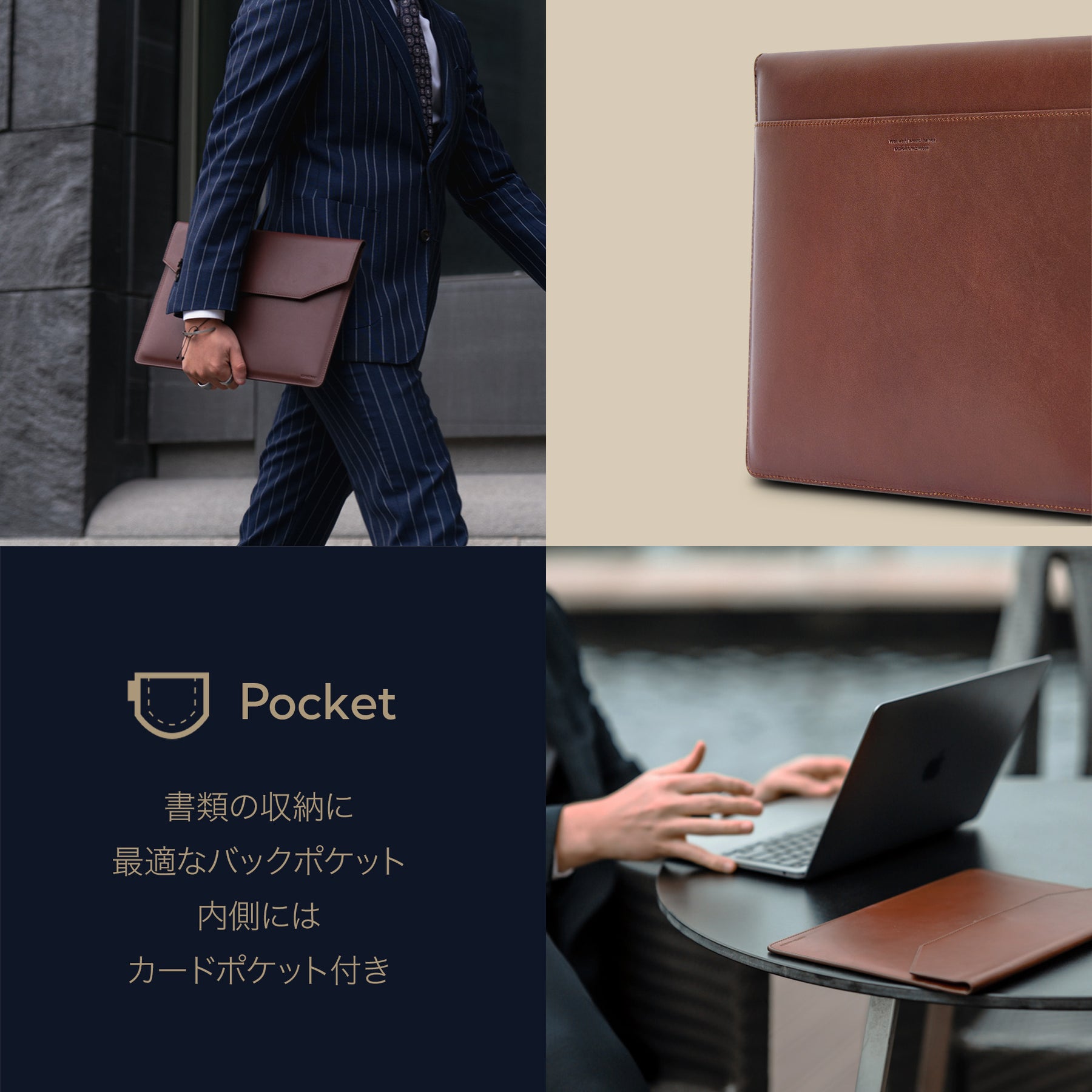 私たちのスリーブケースは機能的です。スカンジナビアデザインをベースとし、ビジネスライフを合理的でシンプルにするために不可欠な機能のみを加えました。側部のスリットを使用すれば、ケースに収納したままパソコンの充電が可能。内側のカードポケットはクレジットカードや名刺が収まるので、いつでも会議に出かけられます。また、バックポケットは、書類やノートの収納に最適。